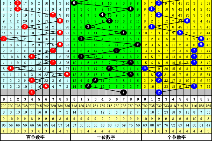 百位分析:该位上期奖号为6,出现0路、偶数、大号,在前11期奖号,该位012路比为4:5:2,2路号码较少,现在012路号码遗漏期数分裂为0、1和7,近期百位刺眼1路号码走热。
