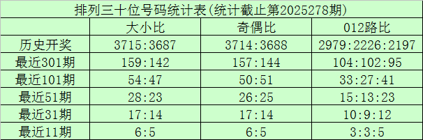 集结11期开奖中,号码012路比为1:5:5,0路号码走冷,本期012路号码分裂轮空:3期、0期和1期,个位近期刺眼2路号码开出。